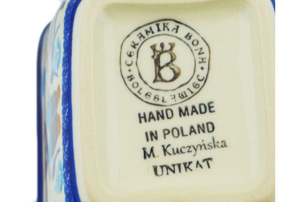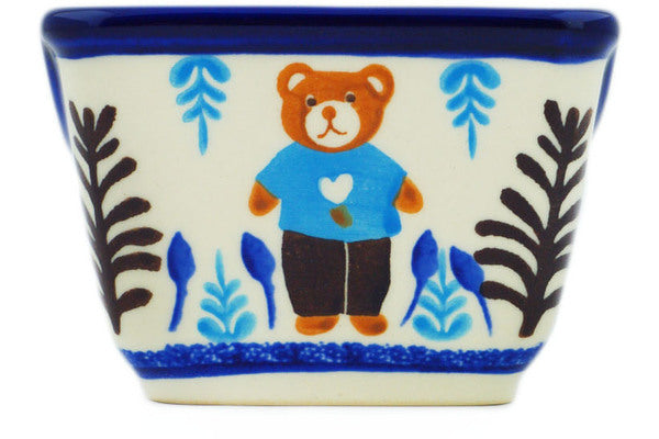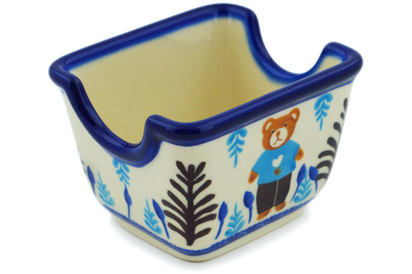 This Polish Pottery Sugar Packet Holder is handmade and handpainted by the Kobaltem Malowane factory in Boleslawiec, Poland. Manufacturer item number H4635N. It is 2½" high and measures 3¾" by 3¼". The capacity of this Sugar Packet Holder is 4.80 oz (brimful) and it weighs 0.5 lbs. It is part of the Teddy's Love Collection.