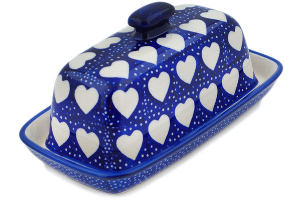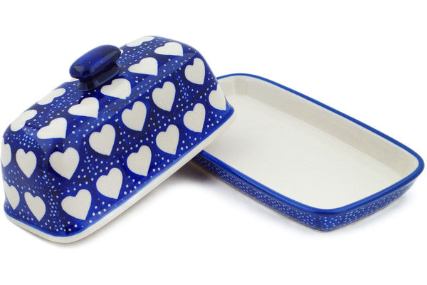 This Polish Pottery Butter Dish is handmade and handpainted by the Manufaktura factory in Boleslawiec, Poland. Manufacturer item number H8203N. It is 4" high and measures 7¾" by 4½". The weight of this Butter Dish is 1.7 lbs. It is part of the Happy Heart Collection.