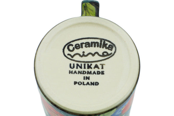 This is a Polish pottery Unikat (Signature) Mug, which means that it has been hand painted with both sponges and brushes and it is signed by the artist who painted it. Unikat pieces are the most intricate works of art. Larger Unikat items take hours of very careful work to finish.